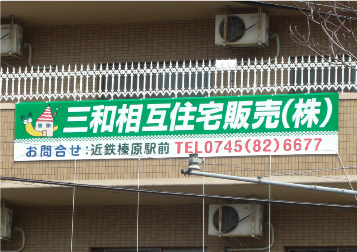 懸垂幕は商業施設やショッピングモールなどで視認性の高い広告効果を期待できます。施設の外壁や施設内の吹き抜け部分に大きな懸垂幕を吊るす事でキャンペーンなどを大きくPRすることが可能です。